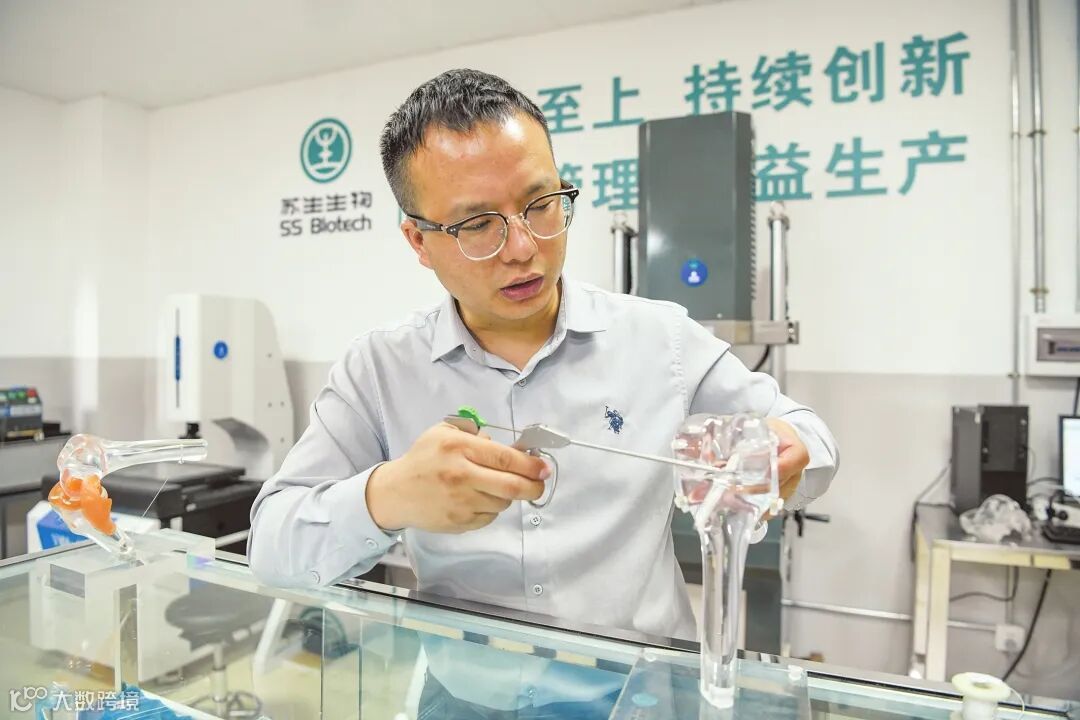 6月28日,海南苏生生物科技有限公司董事长曾胜向记者展示软组织过线器。