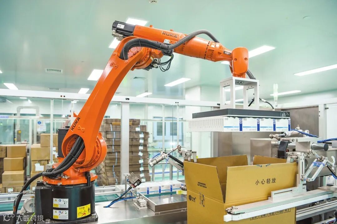 在齐鲁制药(海南)有限公司1000车间内,机器人将药品进行自动装箱、打包。