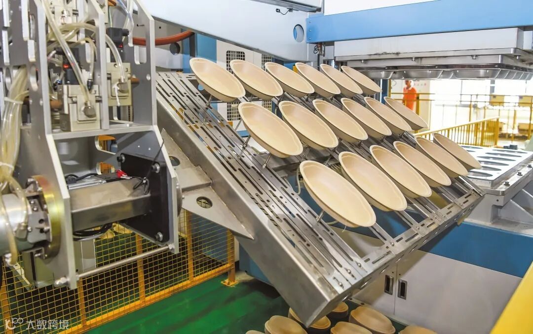 当天,在裕同科技环保及高端包装产业基地一期成型厂房里,流水线上的机械臂,将完成高温热压后的纸碗进行切边处理。一旁的工作人员告诉记者,这批环保餐具将远销西班牙、美国等海外市场。