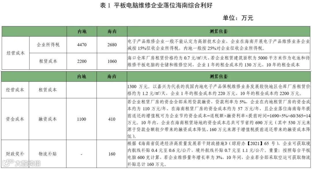 我国某国产平板电脑制造商在海南设立专门开展保税维修业务的分公司,接受出口平板电脑返修业务,业务主要内容为电池更新,所需原料新电池从内地运往海南,返修完成后将平板电脑复出口,业务量为每年26万台,维修费用一般为100元/单,企业每年需从内地调入约26万只新电池,电池成本约为500元,新电池运送到保税维修基地后,企业等待维修产品从国外运输至基地后更换电池、复运出口的周期为2个月。海南自贸港政策下,若企业维修量年增长率为3%,10年间,企业总计可节省企业所得税1790万元,可获取物流补贴总计160万元;若企业租赁厂房的资金全部采用贷款融资,贷款利率为5%,企业在海南获取增值税提前退用于场地租赁,总计可节约资金成本为690万元。