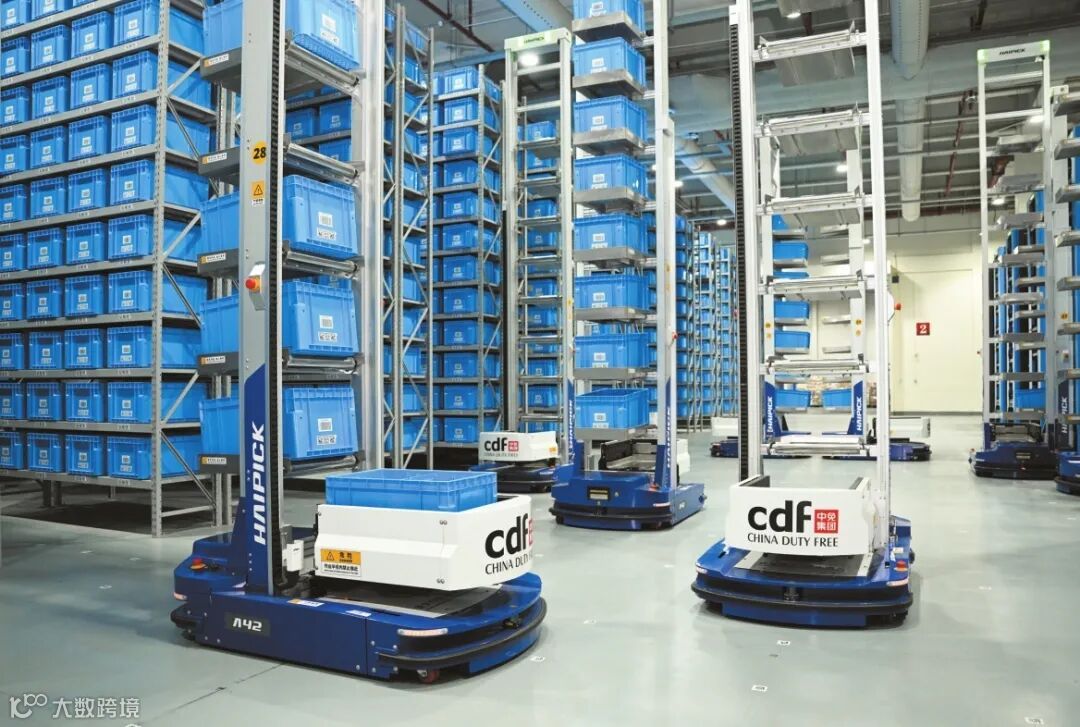 3月20日,在位于海口综合保税区的中免国际物流中心免税品仓库,托盘四向穿梭车等自动化设备按照程序规划路线自动搬运、上架物品。海口日报记者 张俊其 摄
