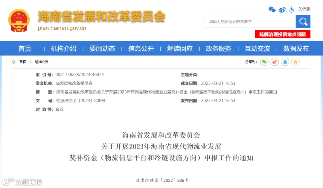 3月21日,海南省发改委官网发布通知,2023年海南省现代物流业发展奖补资金(物流信息平台和冷链设施方向)开始申报,新建冷库(1万立方米及以上)等符合条件的项目,最高可获500万元补贴。