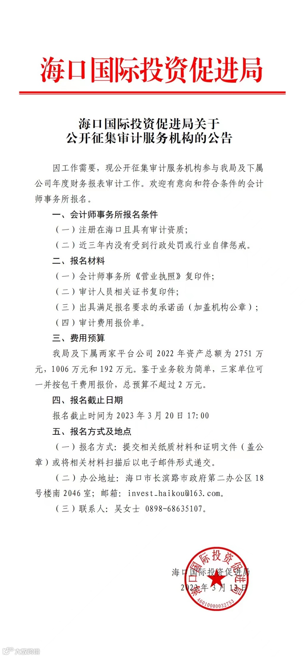 海口国际投资促进局关于公开征集审计服务机构的公告