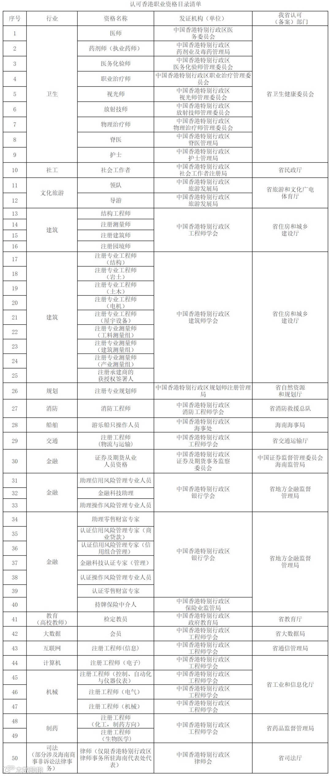征求意见稿还明确了认可香港职业资格目录清单,涉及50项职业资格。