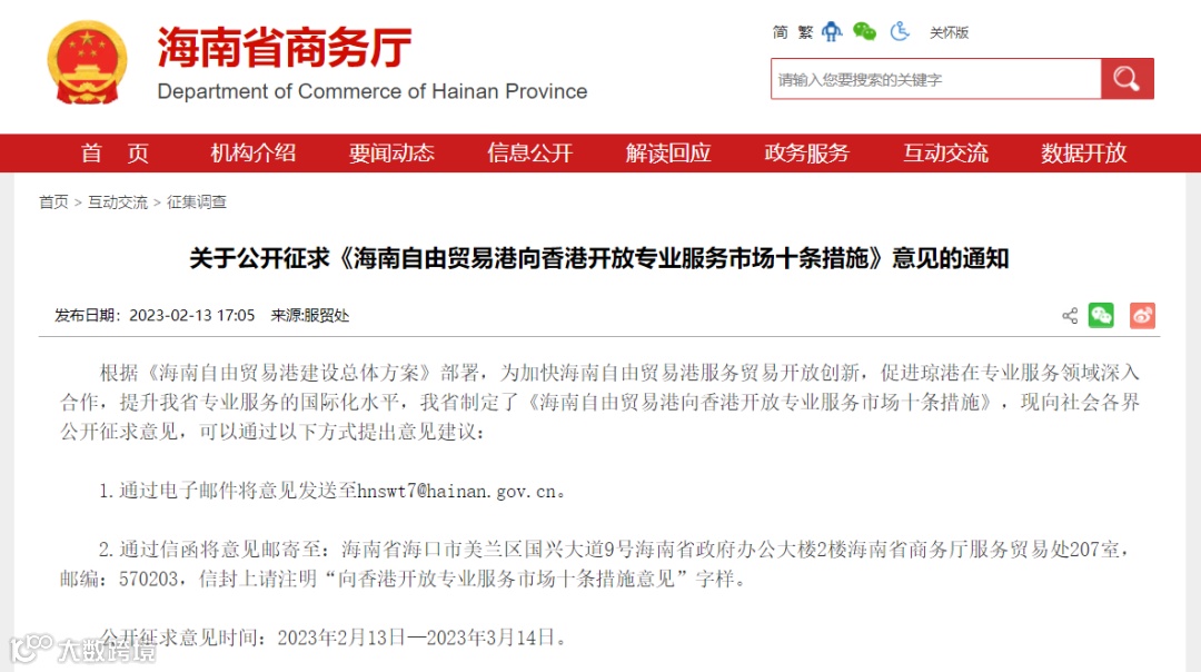 《海南自由贸易港向香港开放专业服务市场十条措施》将出台,自2月13日起向社会各界公开征求意见,征求意见截止时间为3月14日。