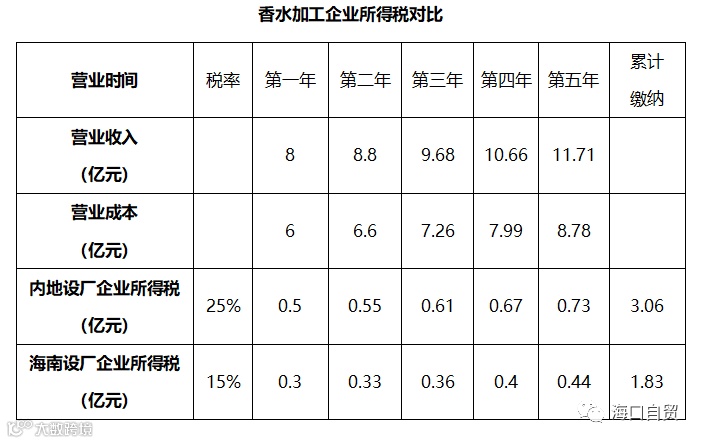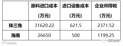综上比较,通过综合经营分析,结合海南自由贸易港政策可知,不考虑设备成本多年摊销,进口香水加工企业在珠三角的年经营成本约3.46亿元,在海南的年经营成本约2.84亿元,可节省约6200万元。