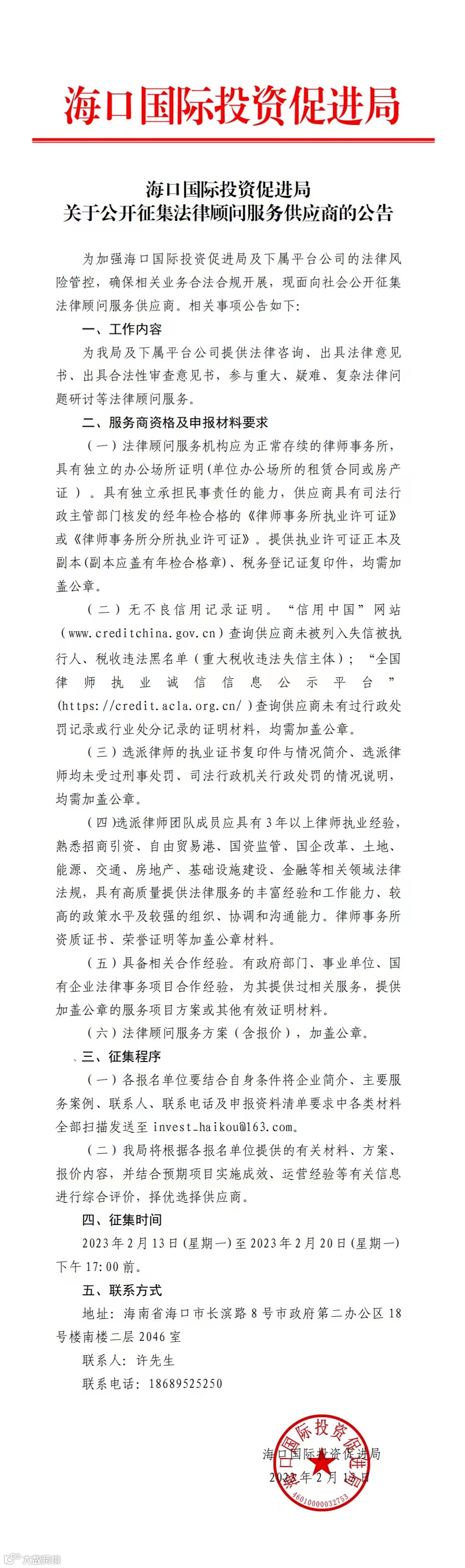 海口国际投资促进局关于公开征集法律顾问服务供应商的公告