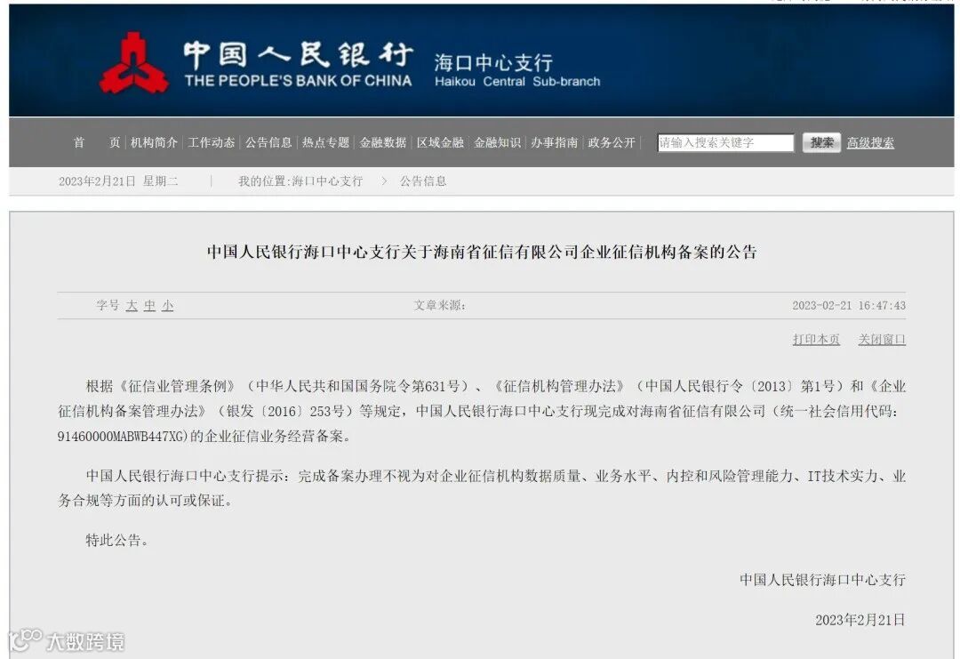 经过三个月的公示期,2月21日,海南省征信有限公司(以下简称“海南征信”)正式成为中国人民银行海口中心支行备案通过的企业征信机构,标志着海南征信可以依法合规对外开展企业征信服务。这也是海南省属国资企业通过人民银行备案的第一家征信机构。