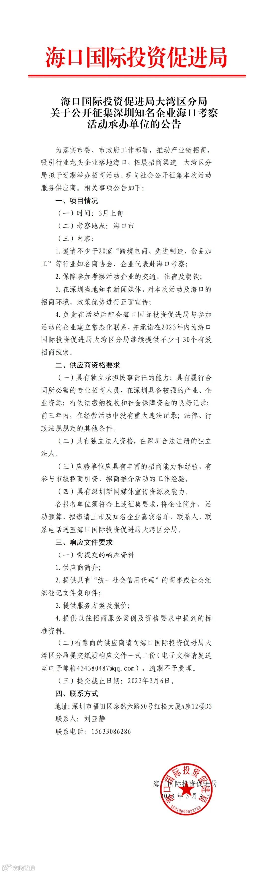 海口国际投资促进局大湾区分局关于公开征集深圳知名企业海口考察活动承办单位的公告