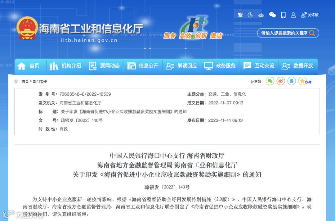 为充分发挥“中征应收账款融资服务平台”(以下简称中征平台)作用,依托供应链核心企业确认增信功能,帮助中小企业盘活应收账款流动资产,以应收账款融资撬动更多对中小企业的信贷支持,近日,中国人民银行海口中心支行、海南省财政厅、海南省地方金融监督管理局、海南省工业和信息化厅联合印发《海南省促进中小企业应收账款融资奖励实施细则》(以下简称《细则》),明确了实施奖励的相关政策。
