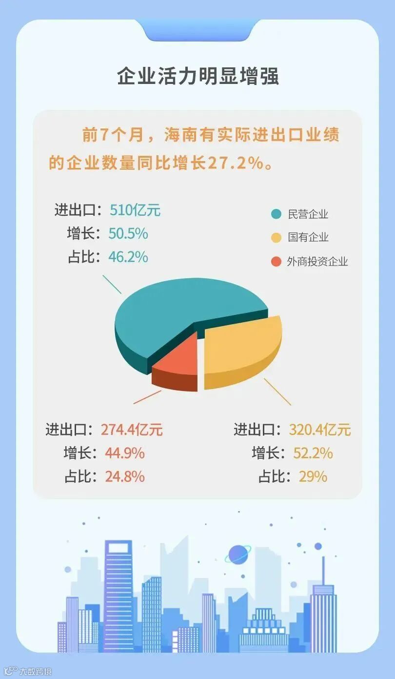 前7个月,海南民营企业进出口510亿元,增长50.5%;国有企业进出口320.4亿元,增长52.2%;外商投资企业进出口274.4亿元,增长44.9%。