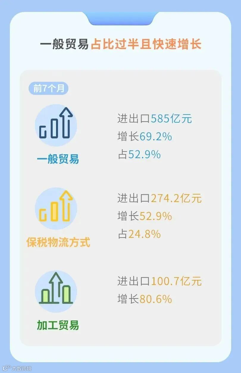 前7个月,海南以一般贸易方式进出口585亿元,增长69.2%;以保税物流方式进出口274.2亿元,增长52.9%;以加工贸易进出口100.7亿元,增长80.6%。