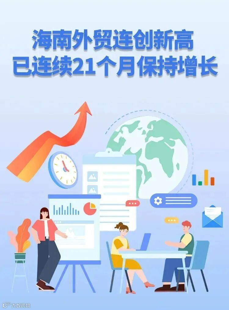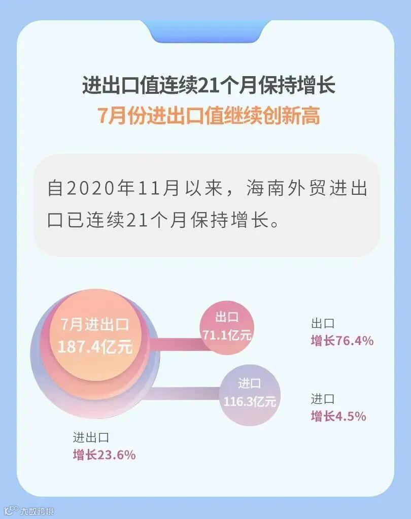 自2020年11月以来,海南外贸进出口已连续21个月保持增长。7月当月,海南进出口187.4亿元,再次刷新前一个月创出的最高记录,增长23.6%。其中,出口71.1亿元,增长76.4%;进口116.3亿元,增长4.5%。