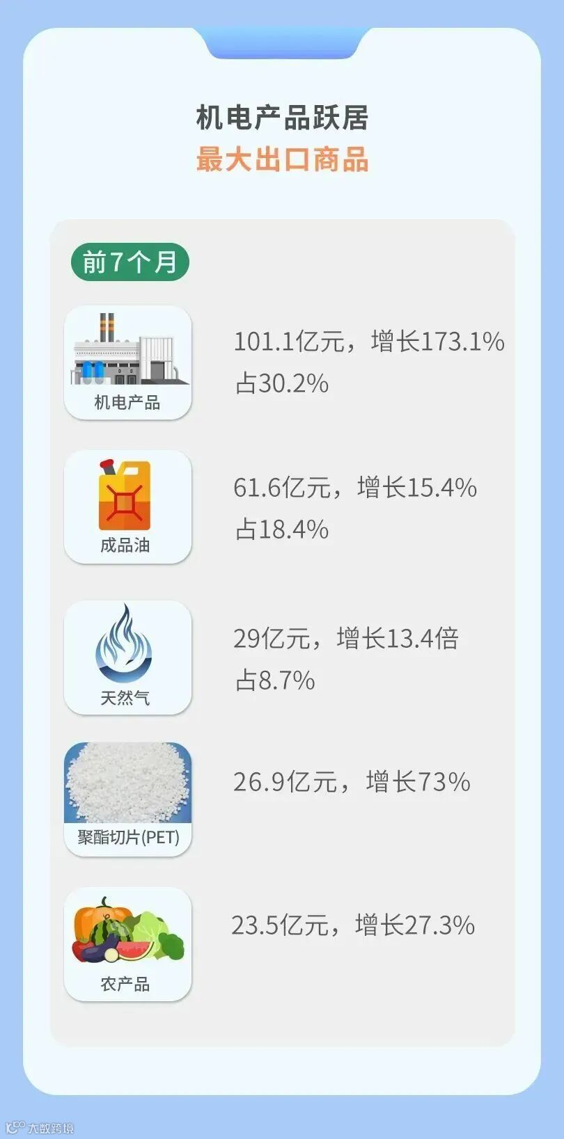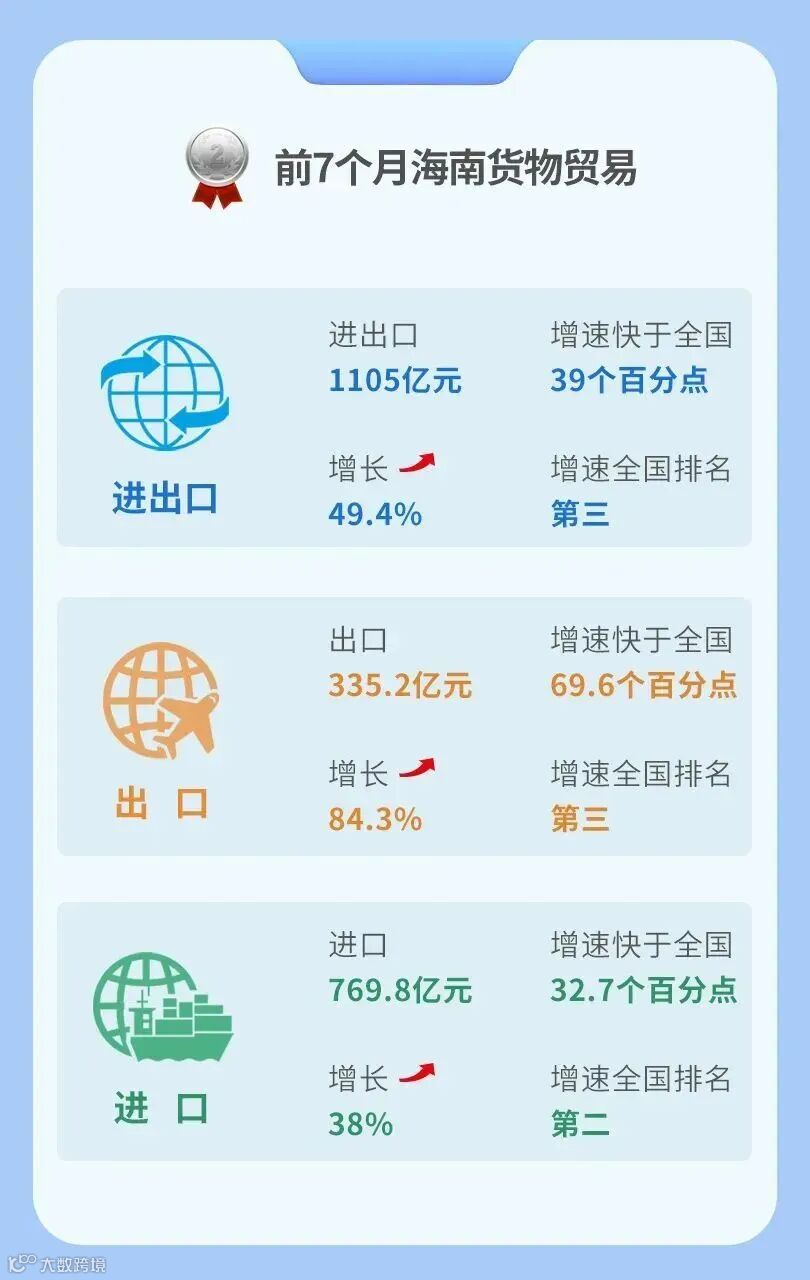 据海口海关统计,前7个月海南货物贸易进出口总值1105亿元,同比(下同)增长49.4%。其中出口335.2亿元,增长84.3%;进口769.8亿元,增长38%。