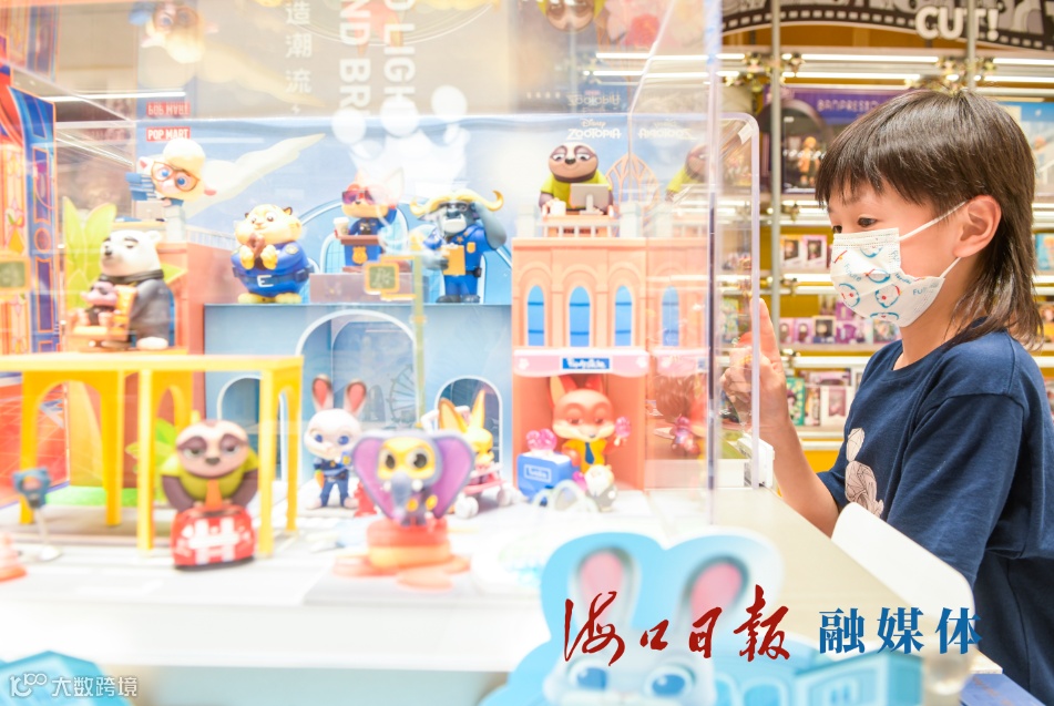 在海口友谊阳光城的一家盲盒实体店内,小朋友被盲盒内的玩偶所吸引。