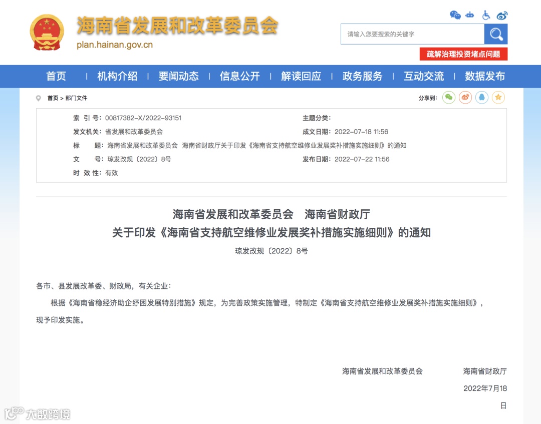 近日,海南省发改委、海南省财政厅联合印发《海南省支持航空维修业发展奖补措施实施细则》(以下简称《实施细则》)。《实施细则》自印发之日起施行,实施至2022年12月31日。资金奖补起始时间认定和测算从2022年1月1日起。