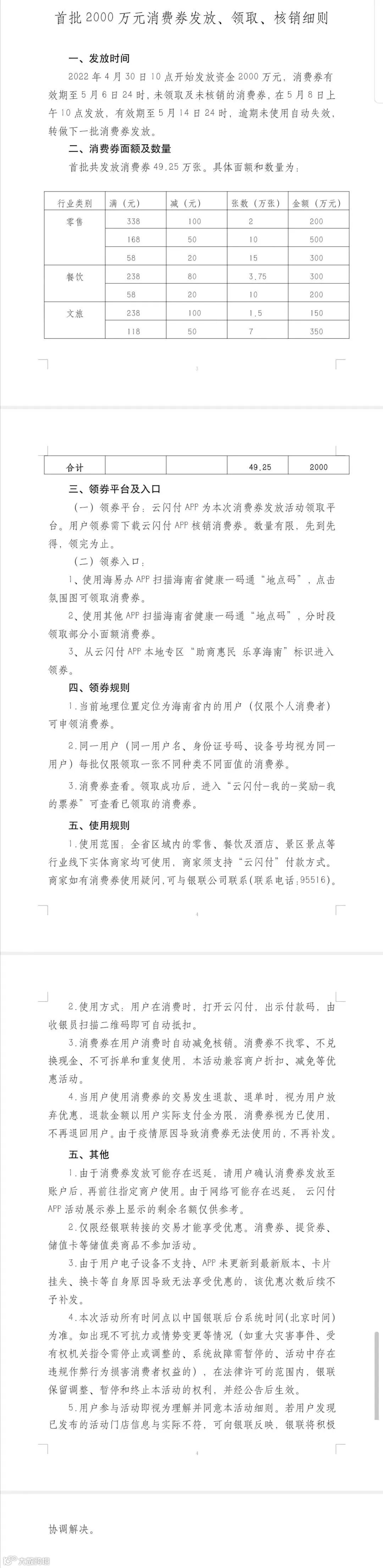 “助商惠民,乐享海南”消费券发放活动首批消费券2000万元、49.25万张,于4月30日10点通过银联云闪付平台向岛内消费者发放。其中,零售业消费券1000万元、27万张,餐饮业500万元、13.75万张,文旅业500万元,8.5万张。每位消费者最多可领取420元消费券,先到先得,领完为止。领券后在消费时出示付款码,扫码自动抵扣,可与商家优惠叠加使用。