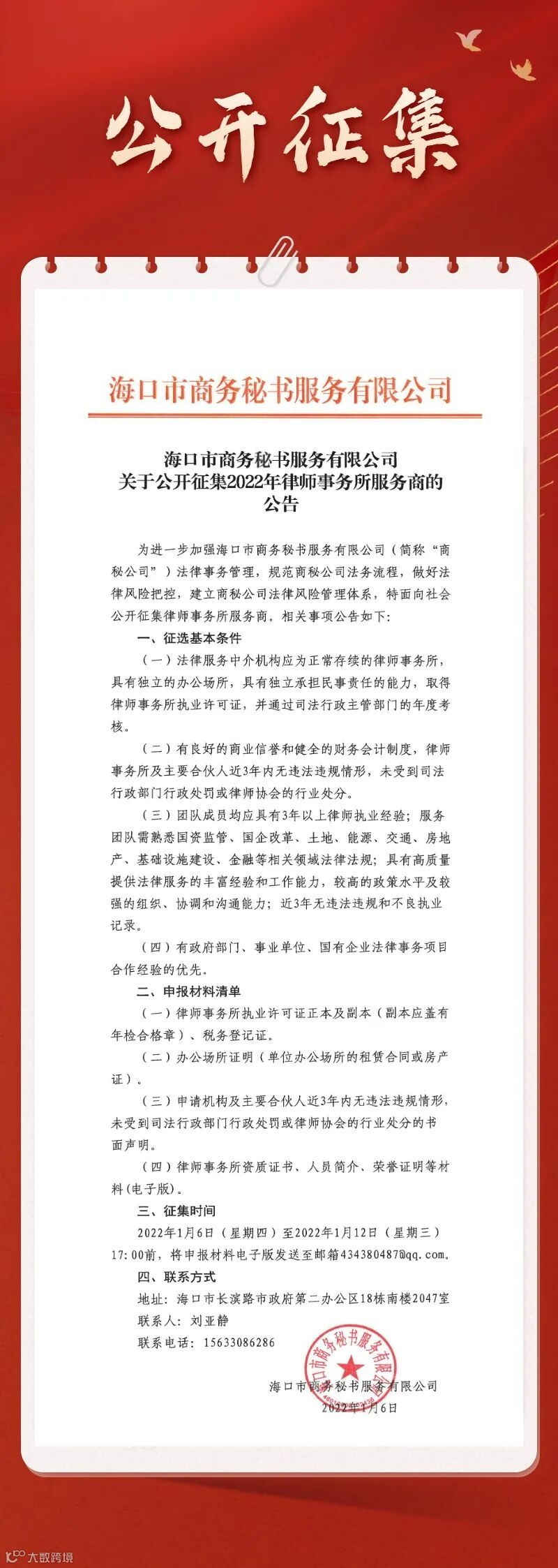 公告|海口市商务秘书服务有限公司关于公开征集2022年律师事务所服务商的公告