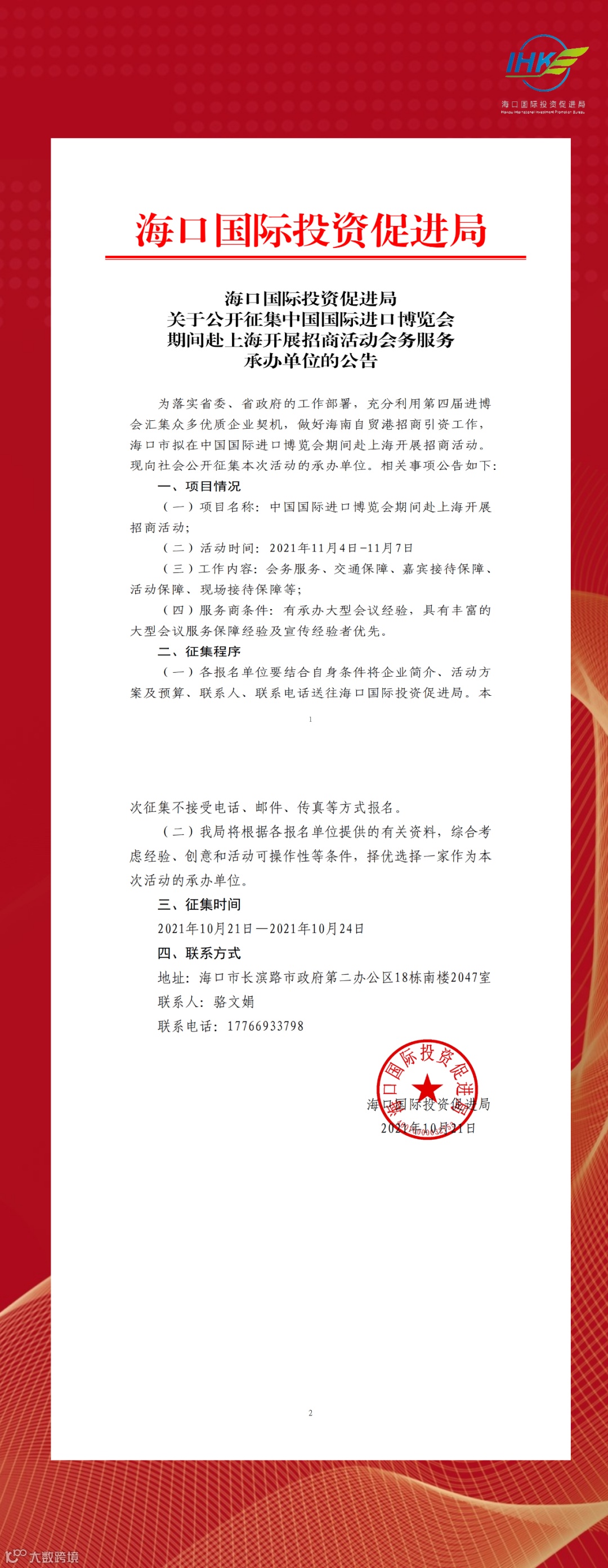 公告丨海口国际投资促进局关于公开征集中国国际进口博览会期间赴上海开展招商活动会务服务承办单位的公告