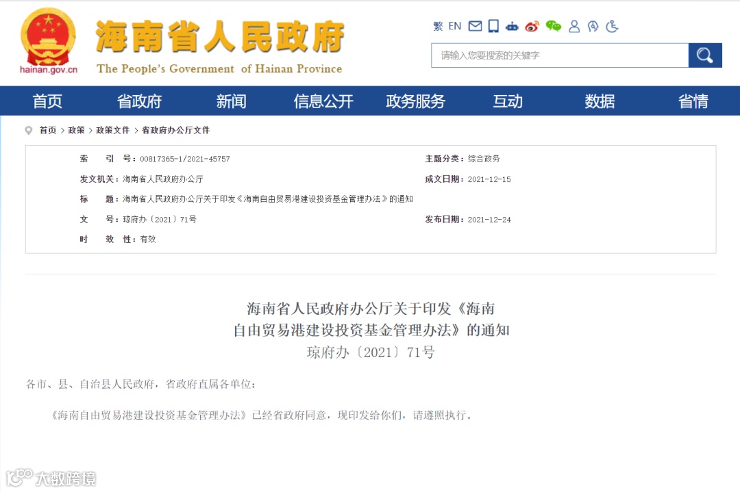 12月24日,海南省人民政府办公厅正式对外公开《海南自由贸易港建设投资基金管理办法》(以下简称《办法》),明确海南自贸港百亿基金的管理职责与架构、投资范围与基金运营、风险控制与监督管理等内容,按照“政府引导、市场运作、科学决策、防范风险”的原则,通过专业化投资运营管理,促进基金持续健康运行,保障政策目标有效实现。