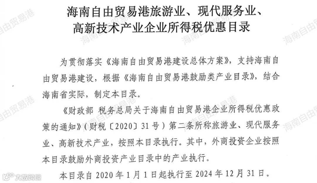 日前,财政部、税务总局联合印发《海南自由贸易港旅游业、现代服务业、高新技术产业企业所得税优惠目录》。这是海南自贸港企业所得税优惠的又一重要政策!本次目录以《海南自由贸易港鼓励类产业目录》为依据制定。《财政部 税务总局关于海南自由贸易港企业所得税优惠政策的通知》第二条所称旅游业、现代服务业、高新技术产业按照本次目录执行!