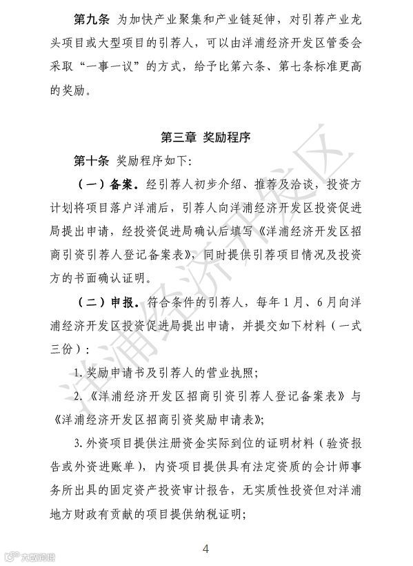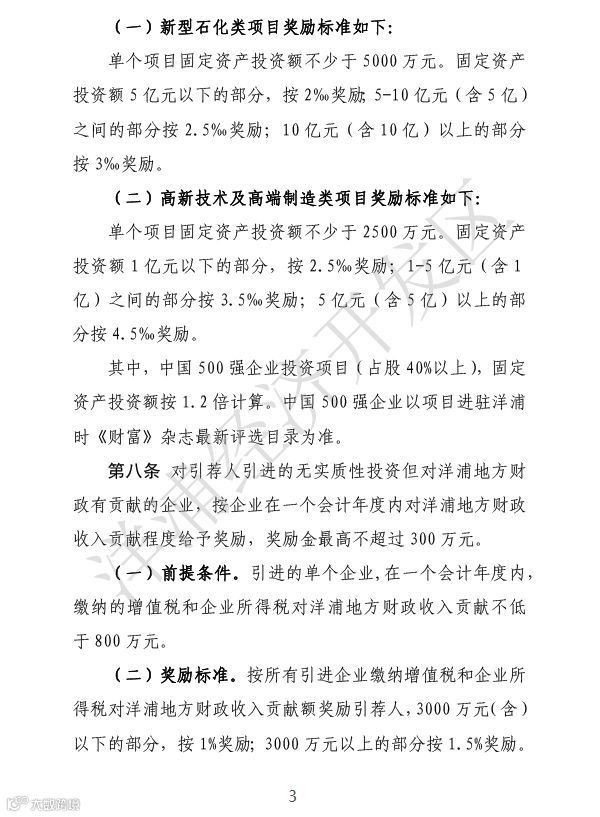 第八条对引荐人引进的无实质性投资但对洋浦地方财政有贡献的企业,按企业在一个会计年度内对洋浦地方财政收入贡献程度给予奖励,奖励金最高不超过300万元。