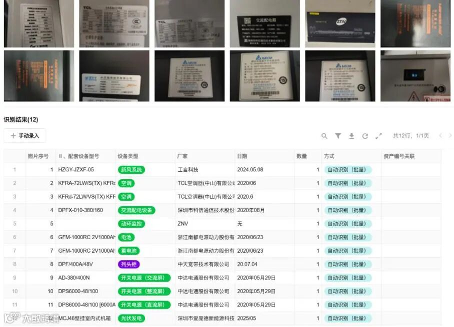 系统创新采用“YOLO目标检测+多模态视觉大模型”双路协同架构。工作时,在高效完成主设备识别的基础上,深度融合千问VL视觉大模型,专门用于解析蓄电池、空调、动环监控等辅助设备的铭牌信息。该架构通过视觉编码器精准提取铭牌区域特征,搭配文本解码器实现跨模态对齐,轻松应对铭牌扭曲、反光、污损等复杂情况,确保非规整铭牌的高鲁棒性识别。同时,系统融合OCR光学字符识别与自然语言理解技术,可自动结构化提取型号、生产日期、序列号等核心资产信息,整体识别准确率超98%,真正实现资产信息“即拍即录、一键入库”,彻底取代了传统低效的手工抄录模式。