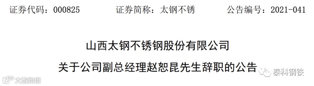8月3日,太钢不锈发布公告,董事会于今日收到公司副总经理赵恕昆递交的书面辞职报告。因职务调整变动原因,赵恕昆向董事会提出辞去公司副总经理职务。赵恕昆辞职后,将不再在公司担任任何职务。