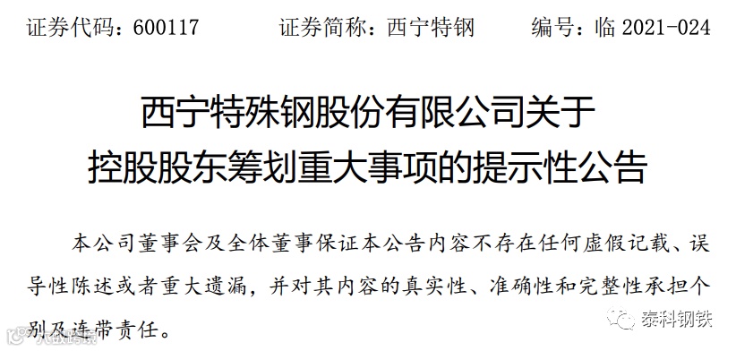 2021年6月21日,西宁特钢发布公告:2021 年6月20日,西宁特殊钢股份有限公司接控股股东西宁特殊钢集团有限责任公司通知,西钢集团正在筹划以下重大事项: