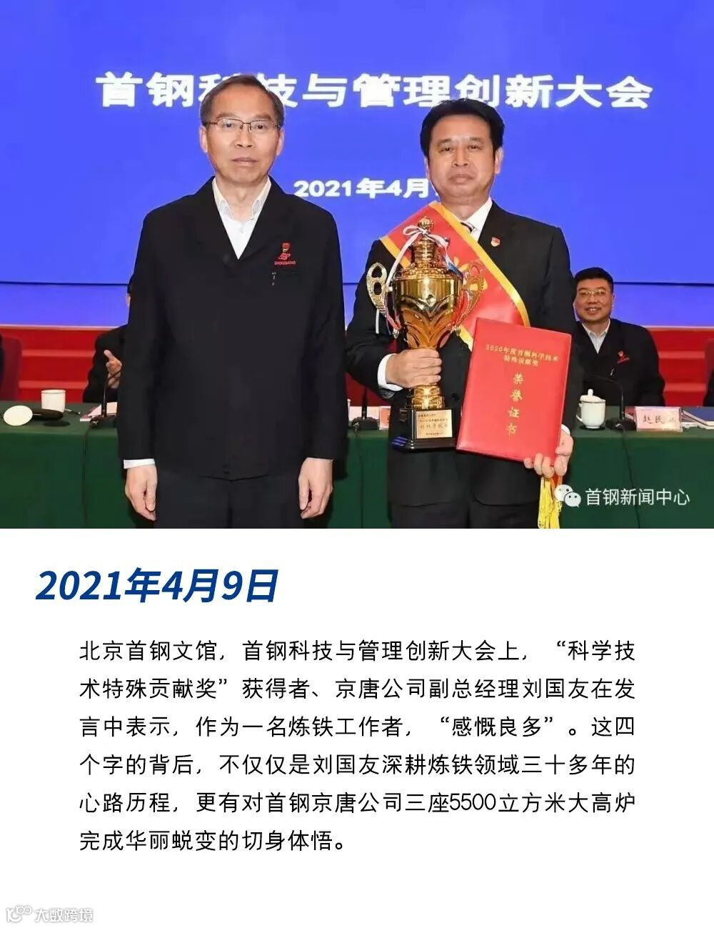 2021年4月9日,一身正装的刘国友从集团领导手中接过奖杯和证书后说:以高效制造、绿色制造、智能制造为方向,探索高炉可持续发展新道路。