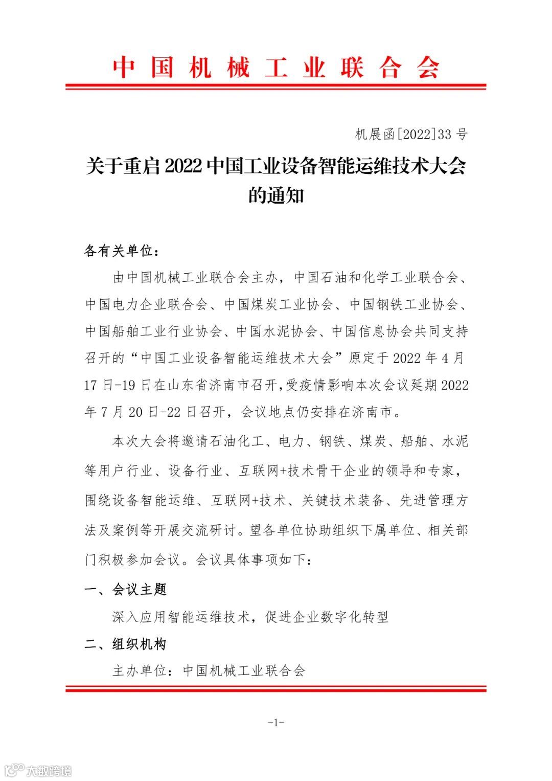 由中国机械工业联合会主办,中国石油和化学工业联合会、中国电力企业联合会、中国煤炭工业协会、中国钢铁工业协会、中国船舶工业行业协会、中国水泥协会、中国信息协会共同支持召开的“中国工业设备智能运维技术大会”定于2022年7月20日-22日将在山东济南召开。