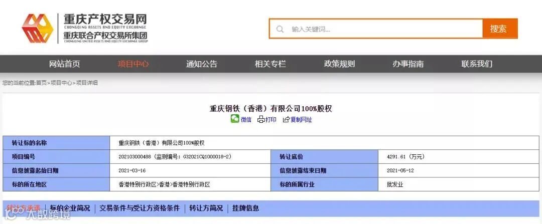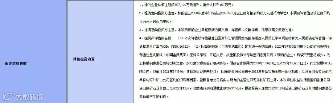 挂牌信息显示,因重庆钢铁矿石统一采购部署,2020年8月起重钢股份公司矿石采购全部通过重庆钢铁原料公司统一开证执行,故重钢股份公司与重钢香港公司(即标的企业)后续贸易量将减少,为支持重钢香港公司转型和过渡,双方建议重新签订框架协议,明确合作期限为2020年10月31日至2022年12月31日止,约定总量800万吨以内,但截止2021年3月9日,该框架协议仍未签订。因重钢股份公司将于2023年开始实施采购一体化战略,以及重钢香港公司不具备与海外矿山公司签约的资质等因素,重钢香港公司将失去所有的主营进口海外铁矿石业务。挂牌信息还明确,转让成功股权变更后,标的企业名称将不再使用“重庆钢铁”字号。