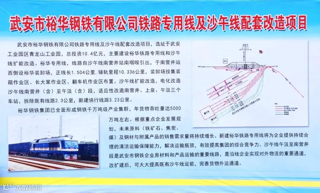 武安市裕华钢铁有限公司铁路专用线及沙午线配套改造项目,总投资10.4亿元,主要建设裕华铁路专用线和沙午线扩能改造。裕华专用线,线路自沙午线南营井站南咽喉引出,于南营井站西侧设裕华装卸场,正线长1.504公里,铺轨里程10.336公里,装卸场按集装箱作业区、长大笨作业区、翻车机作业区布置。沙午线扩能改造,电化改造沙午线南营井(含)至午汲(含) 段,适应性改造南营井、上泉、午汲三个车站,拆除既有线路2.3 公里,新建绕行线路3.23公里。