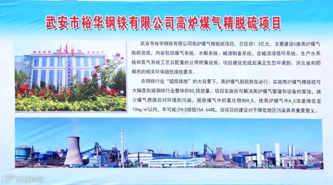 武安市裕华钢铁有限公司高炉煤气精脱硫项目,总投资1.3亿元,主要建设5 座高炉煤气脱硫设施,内容包括煤气系统、水解系统、碱液制备系统、含碱溶液循环系统、生产水系统和氮气系统工艺及配套的公用附属设施。项目建设完成后可满足生态环境部、河北省和邯郸市的相关环保超低排放要求。