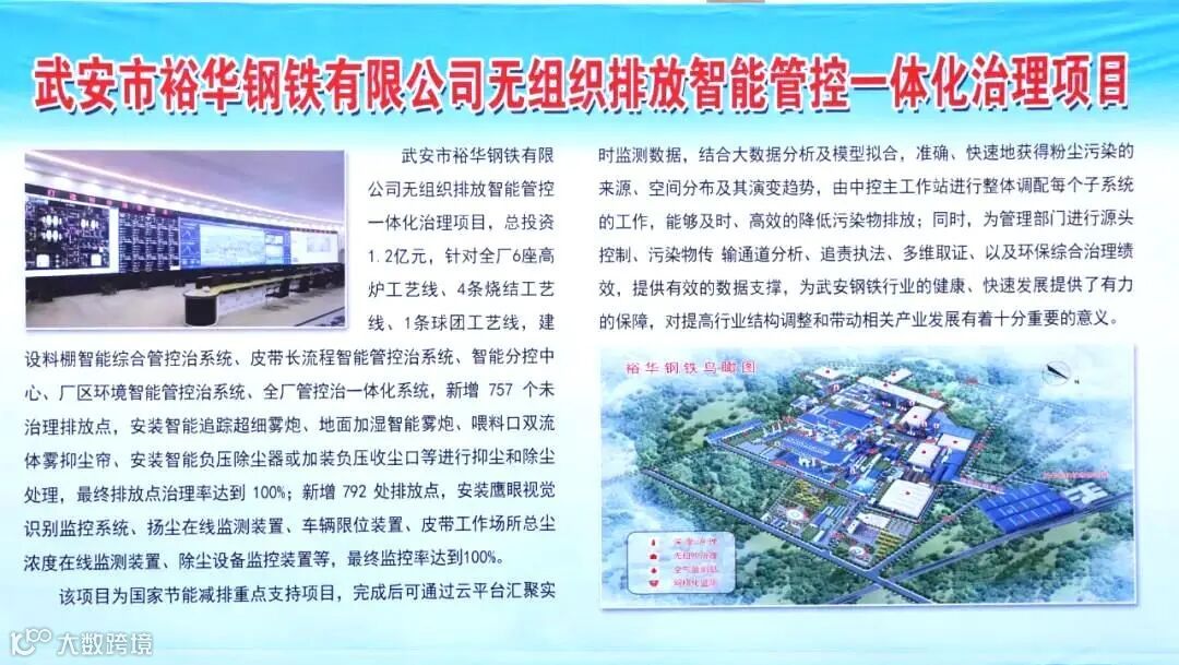 武安市裕华钢铁有限公司无组织排放智能管控一体化治理项目,总投资1.2亿元,针对全厂6座高炉工艺线、4条烧结工艺线、1条球团工艺线,建设料棚智能综合管控治系统、皮带长流程智能管控治系统、智能分控中心、厂区环境智能管控治系统、全厂管控治一体化系统,新增757个未治理排放点,安装智能追踪超细雾炮、地面加湿智能雾炮、喂料口双流体雾抑尘帘、安装智能负压除尘器或加装负压收尘口等进行抑尘和除尘处理,最终排放点治理率达到100%;新增792处排放点,安装鹰眼视觉识别监控系统、扬尘在线监测装置、车辆限位装置、皮带工作场所总尘浓度在线监测装置、除尘设备监控装置等,最终监控率达到100%。