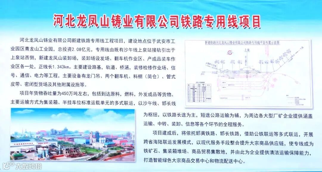 河北龙凤山铸业有限公司新建铁路专用线工程项目,总投资2.08亿元,专用线由既有沙午线上泉站接轨引出于上泉站西侧,新建龙凤山装卸场,装卸场设发场、翻车机作业区、产成品装车作业区各一处,正线长1.343km。主要建设路基、轨道、桥涵、装修检修作业场、信号、通信、电力等工程,主要设备有龙门吊、两个翻车机、料棚(简仓)、管式皮带、密闭型货场及其他附属设施等。