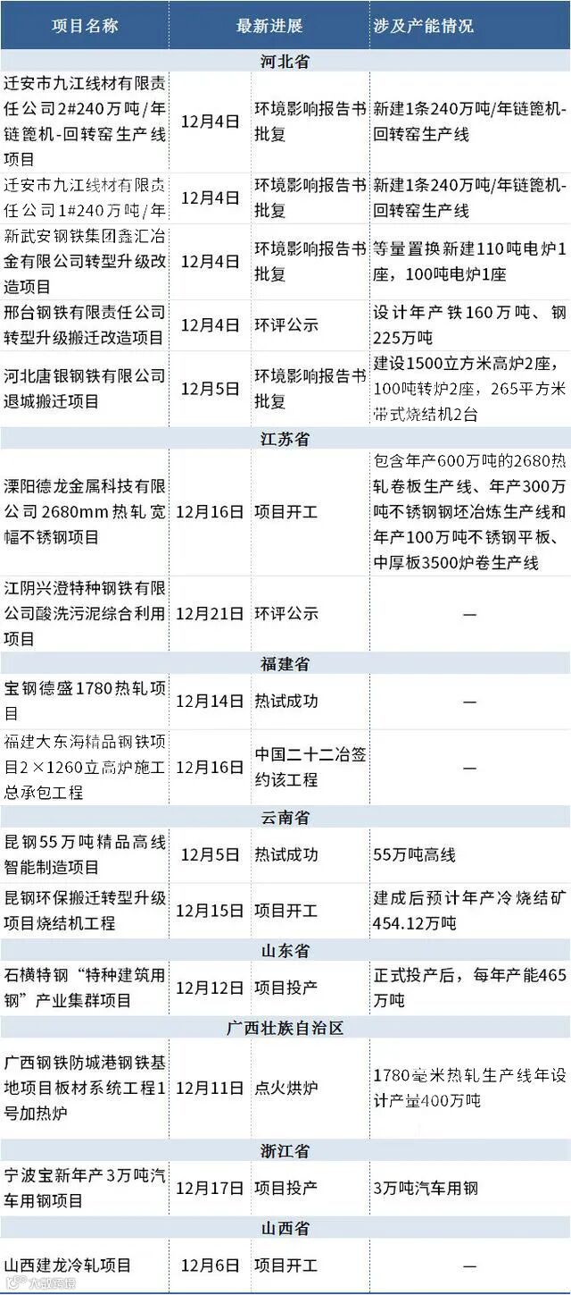 据不完全统计,截至12月30日,12月共15个钢铁项目有新动态。其中,4个项目环境影响报告书批复,3个项目开工,环评公示、热负荷试车成功和投产的项目各2个,点火烘炉和签约的项目各1个。项目具体内容如下: