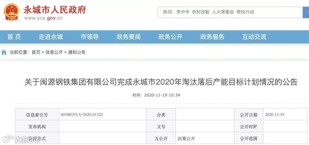 经核查,闽源钢铁集团有限公司按照《永城市2020年淘汰落后产能目标计划》要求,已完成1座630立方米高炉73万吨生铁产能淘汰工作,并通过了市级联合验收小组的验收,现予以公告,欢迎社会公众进行监督。