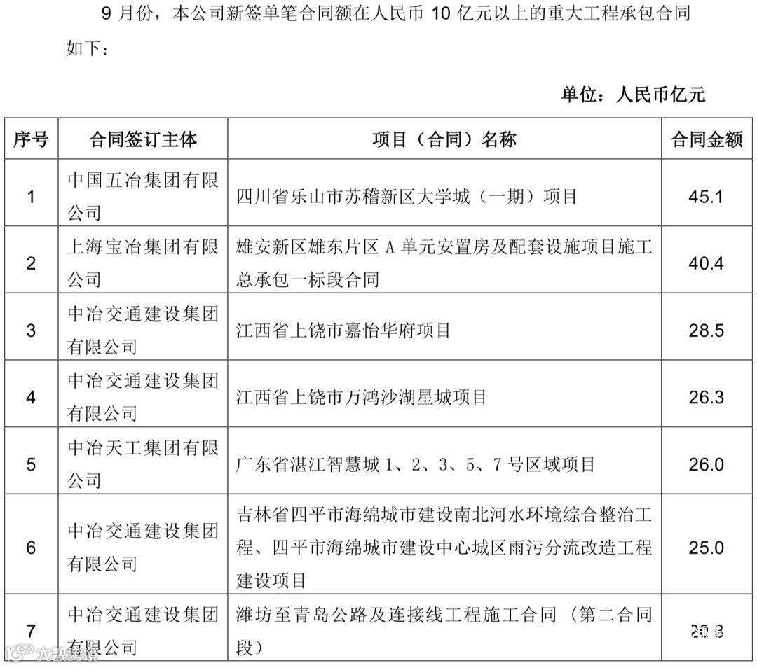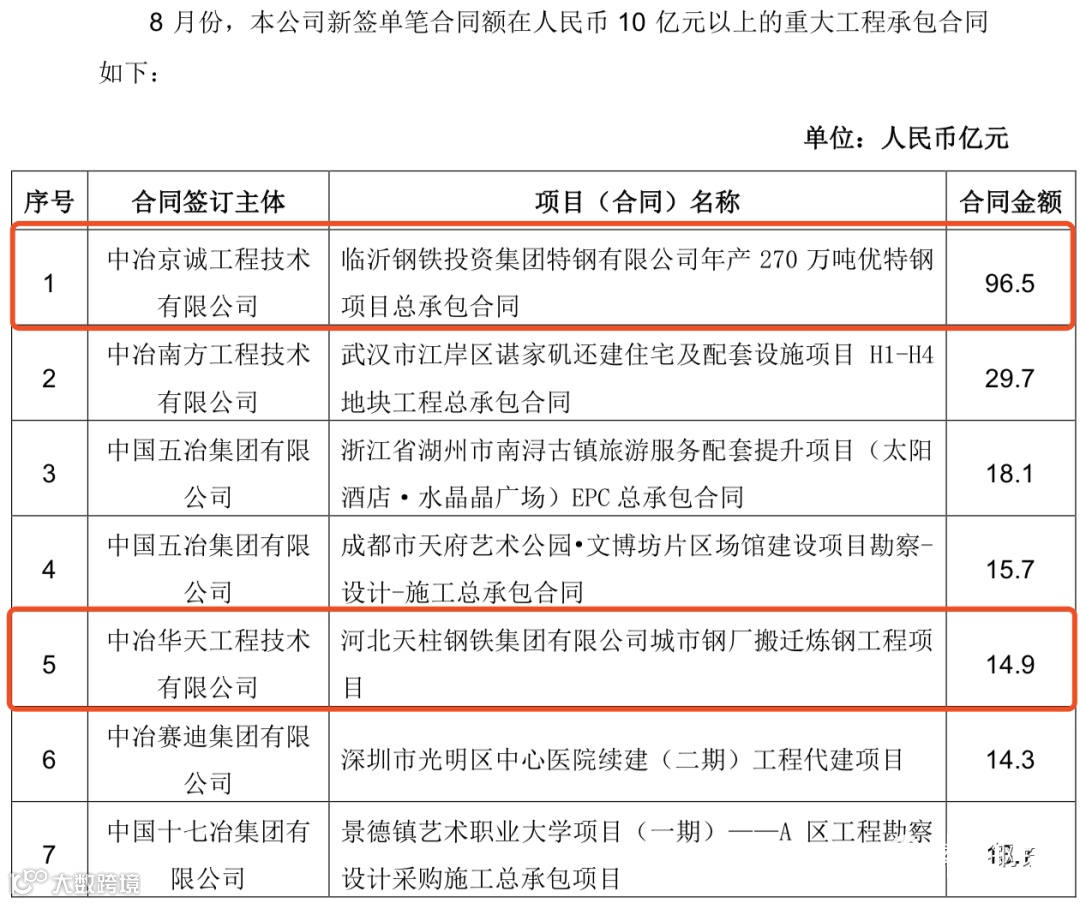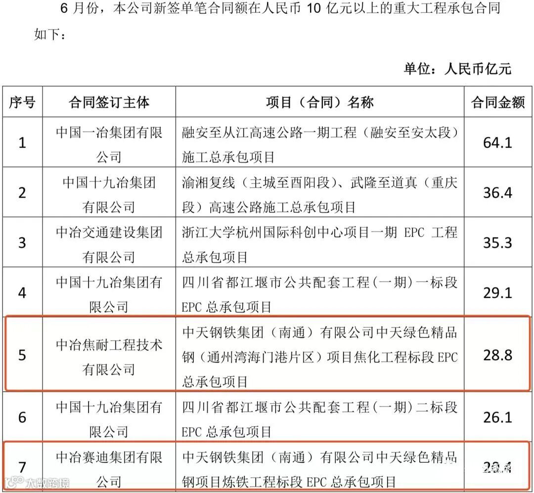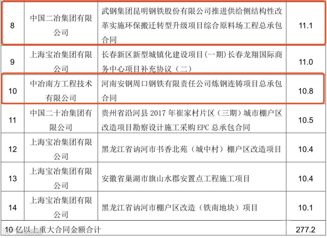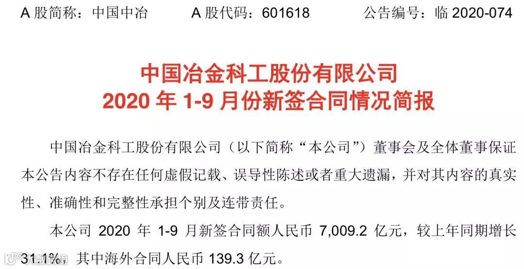 中国中冶2020年1-9月新签合同额人民币7009.2 亿元,较上年同期增长31.1%,其中海外合同人民币 139.3 亿元。其中10亿元以上的重大钢铁工程承包合同19个,合同金额高达372.6亿!具体如下: