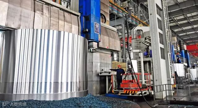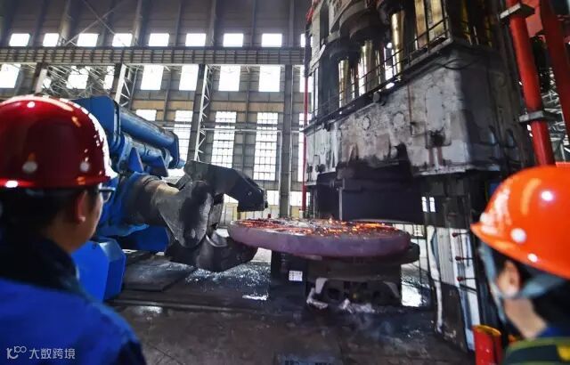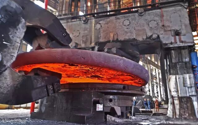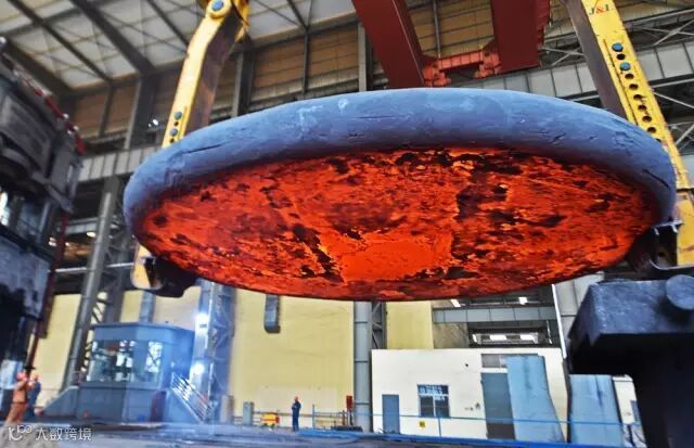▲这是钢锭经过数次回炉锻压后,基本成型的直径7.8米加氢管板在油压机上锻压时的场景