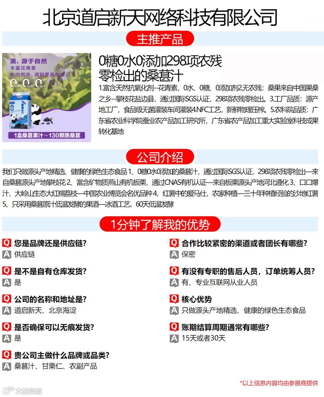 北京道启新天网络科技有限公司只做源头产地精选、健康的绿色生态食品 1、0糖0水0添加的桑葚汁,通过国际SGS认证,298项农残零检出—来自桑葚源头产地攀枝花 2、富含矿物质燕山有机板栗,通过CNAS有机认证—来自板栗源头产地河北遵化 3、口口爆汁,大岭山生态大红糯荔枝—中国农业博览会名优品种 4、红薯中的爱马仕,农家种植—三十年种植经验的沙地红薯 5、只采用桑葚原汁低温发酵的果酒—冰酒工艺,60天低温发酵