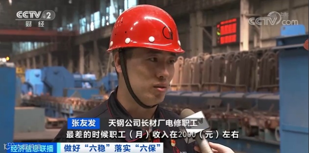 天钢公司长材厂电修职工张友发:最差的时候,职工月收入在2000元左右,时不时就停车检修,没有指标、没有产量,职工的精神状态说白了就是混日子。