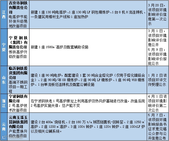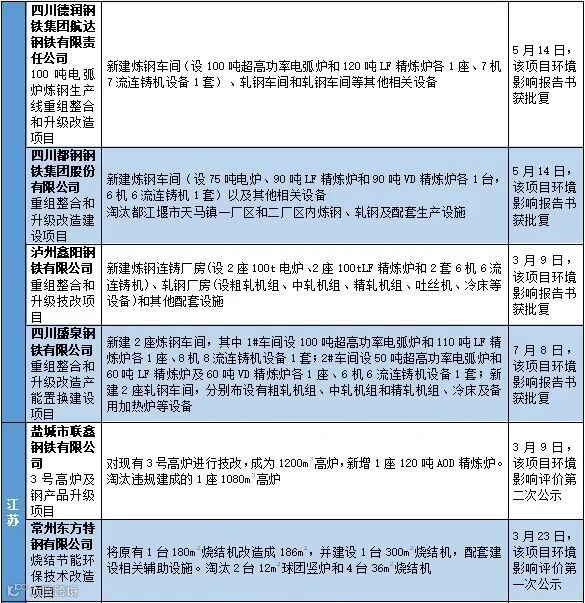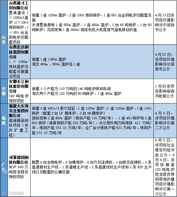 据不完全统计,今年上半年,有22个钢铁项目进行了环境评估公示或者得到了批复,其中包括产能置换项目、退城搬迁项目和升级改造项目等。从地域来看,多集中在华东和华北区域,从省份上来看,河北省、四川省的项目较多,各有5个。具体如下: