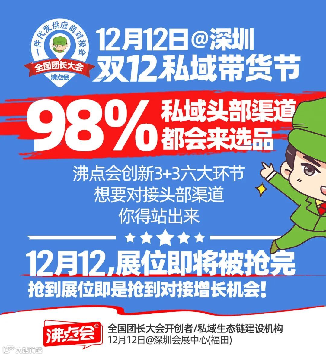 双12私域带货节是由沸点会展举办的,将于12月12日在深圳会展中心(福田)举办,同期举办1212深圳私域团长大会,届时全国98%做得好的私域头部团长都会来现场选品