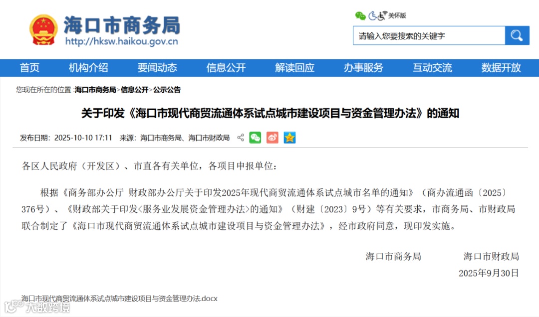 来源:海口市商务局、海口市财政局、海口发布微信公众号