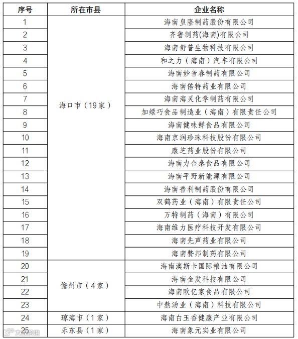 本批25家企业中,海口市19家、儋州市4家、琼海市1家、乐东黎族自治县1家。后续,我省将根据企业申请、各相关单位审核情况,陆续分批发布加工增值试点转备案企业名单。相关备案企业在海南自由贸易港封关运作后按照海关总署公告2025年第158号有关要求开展加工增值免关税业务。