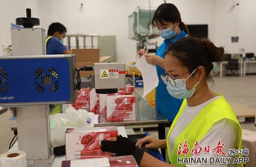 在位于海口日月广场的海控全球精品免税城仓库里,工作人员使用激光打标机选取粘贴溯源码的区域。海南日报全媒体记者 李天平 摄