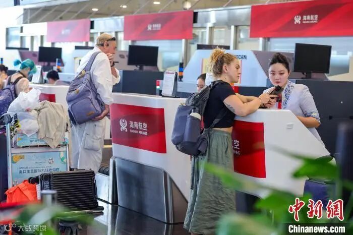 5月7日,海口往返伦敦国际航线正式通航。图为英国旅客在海口美兰国际机场办理值机手续。中新社记者 骆云飞 摄
