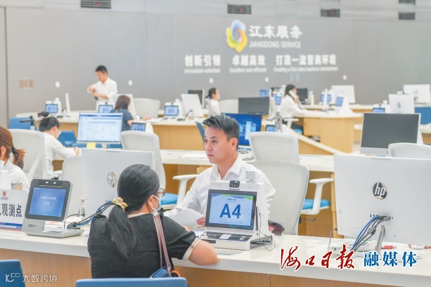 在海口江东新区管理局政务服务中心,工作人员为企业办理业务。记者 孙士杰 摄