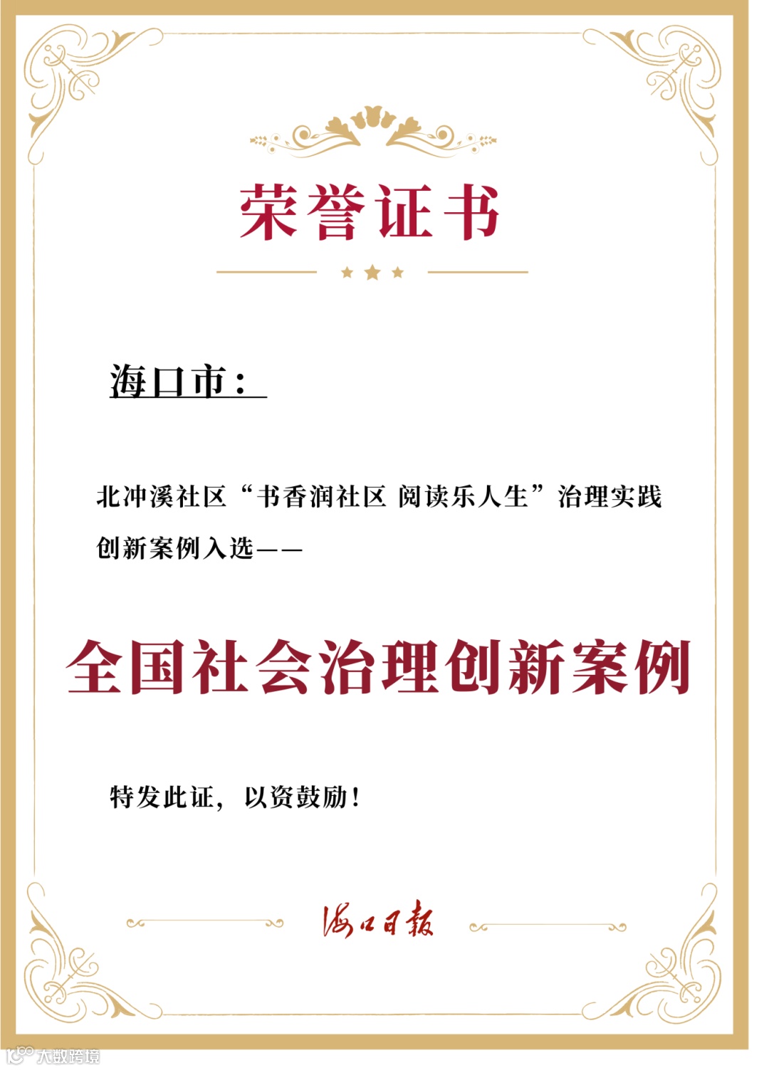 11月份,全国社会治理创新案例(2024)入选名单正式发布,海口市琼山区北冲溪社区“书香社区”的“书香润社区 阅读乐人生”治理实践创新案例榜上有名,也是全省唯一入选的案例。